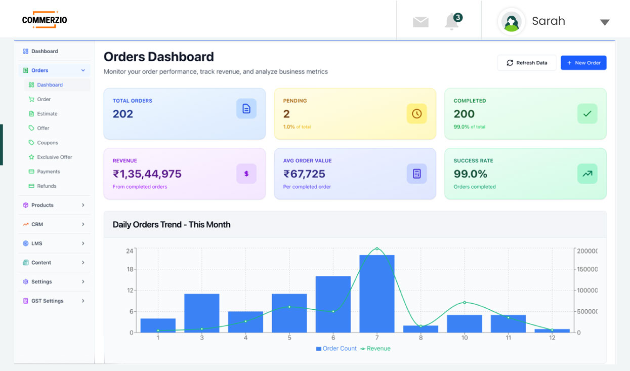 Managing separate tools for marketing, CRM, analytics, and logistics can be overwhelming. Commerzio simplifies this by offering a single integrated dashboard that covers every business function. Its end-to-end visibility and AI-driven automation make management easier, faster, and far more effective for every team.